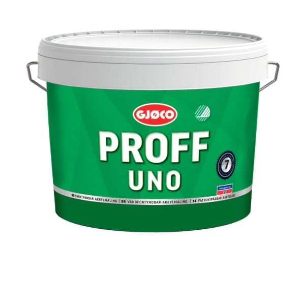 Gjøco Proff Uno 7 er en professionel, vandbaseret og lugtsvag interiørmaling baseret på ren akryl. Denne svanemærkede maling dækker effektivt og giver en jævn, slidstærk og vaskbar overflade, som holder sig flot i mange år. Den er derfor et oplagt valg til både private boliger, erhverv, håndværkere og malermestre, der ønsker et pålideligt og miljøvenligt produkt.