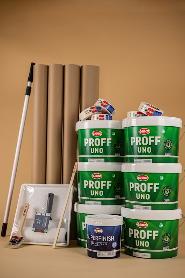 Skal du male et rum på ca. 110-120 m², får du her en komplet malingpakke, der indeholder alt, hvad du behøver for et flot og professionelt resultat. Pakken er sammensat med kvalitetsprodukter fra Gjøco og Master, så du både får den rette maling og det rigtige værktøj.