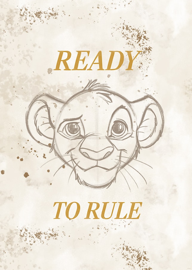 Et charmerende kunsttryk af en ung Simba, der fanger modet og beslutsomheden hos en kommende konge. Den kunstneriske skitseeffekt kombineret med den subtile baggrund giver designet et elegant og tidløst udtryk. Ordene ‘Ready to Rule’ motiverer og inspirerer – perfekt til små løver, der drømmer om store eventyr. Et stærkt blikfang til ethvert rum!