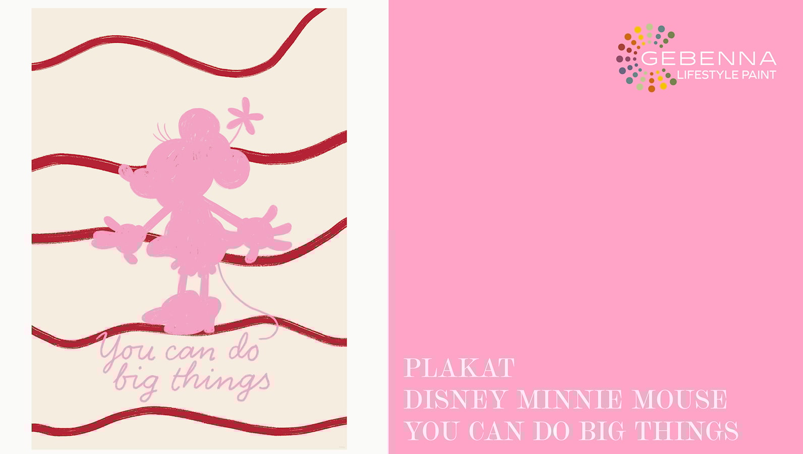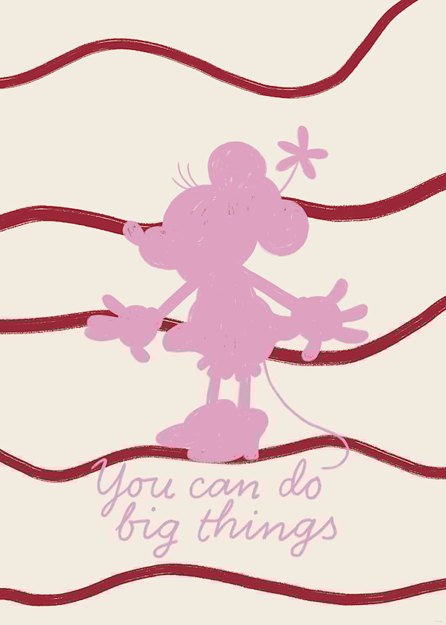 Med charmerende minimalisme og et strejf af inspiration bringer denne kunstplakat et smil frem. Silhuetten af Minnie, kombineret med det motiverende budskab "You can do big things", minder os om, at store drømme altid begynder med små skridt. De bløde farver og buede linjer gør den til et stilfuldt blikfang i ethvert rum.