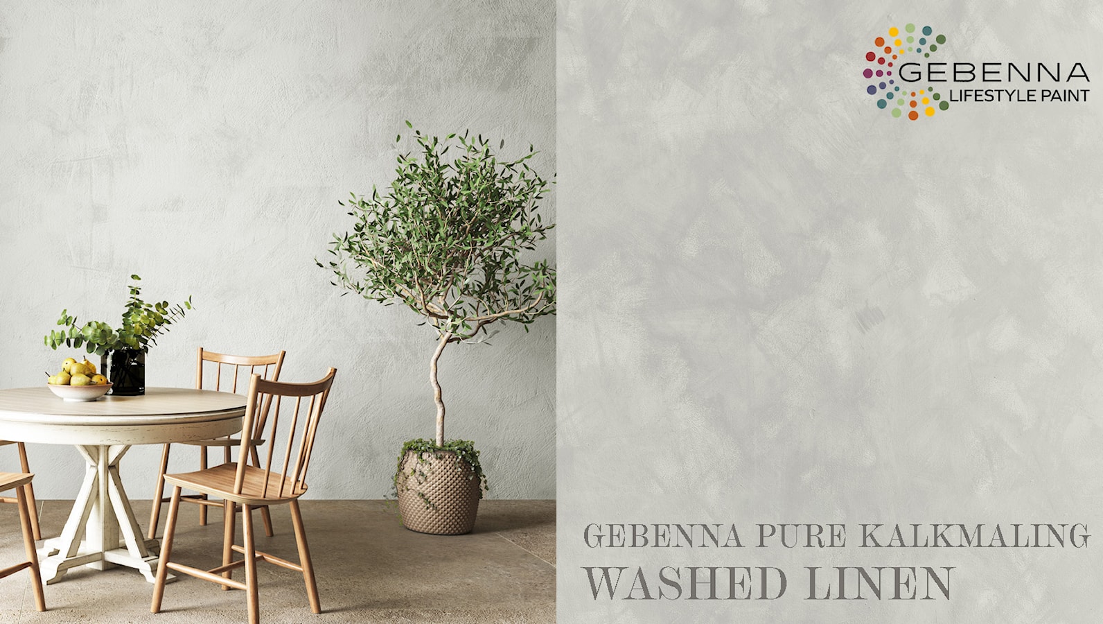 Inviter naturens farger inn med kalkmaling fra Gebenna. Kalkmalingen er produsert av naturlige materialer og skaper et vakkert, naturlig spill på veggen. Den myke og matte teksturen fremhever de naturlige elementene og skaper en følelse av trygghet, ro og balanse.