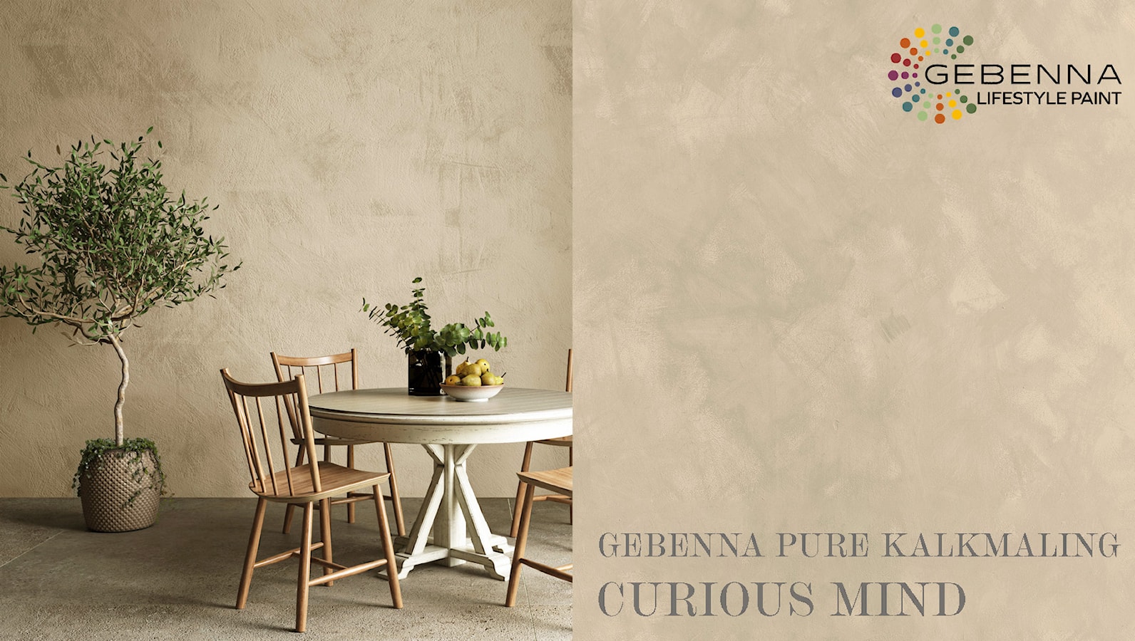 Inviter naturens farger inn med kalkmaling fra Gebenna. Kalkmalingen er produsert av naturlige materialer og skaper et vakkert, naturlig spill på veggen. Den myke og matte teksturen fremhever de naturlige elementene og skaper en følelse av trygghet, ro og balanse.