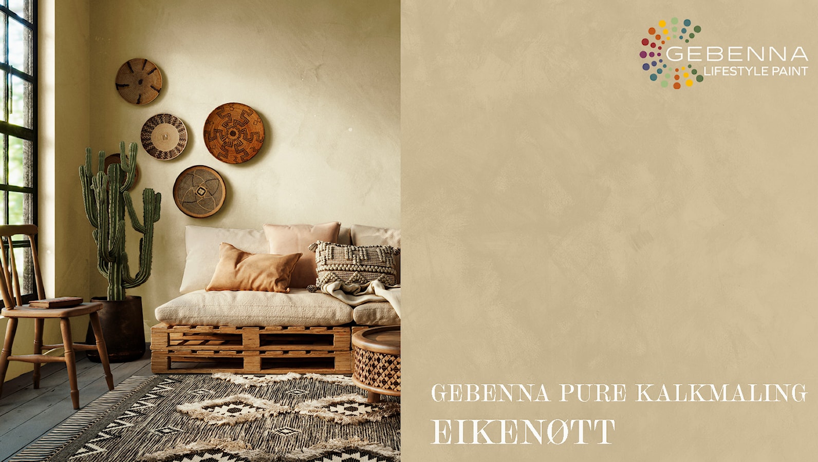 Inviter naturens farger inn med kalkmaling fra Gebenna. Kalkmalingen er produsert av naturlige materialer og skaper et vakkert, naturlig spill på veggen. Den myke og matte teksturen fremhever de naturlige elementene og skaper en følelse av trygghet, ro og balanse.