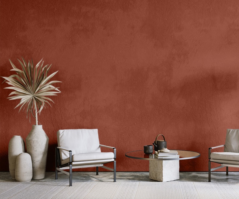 Med röd kalkfärg kan du enkelt balansera färgen med neutrala toner som beige, grått eller trä för ett harmoniskt intryck.